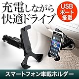 iPhone・スマートフォン車載ホルダー(USB充電ポート付) 車のシガーソケットに挿し込んでiPhone・スマートフォンなどを設置できる車載用ホルダー。USB充電用ポートを装備しているので、バッテリー残量を気にせず充電しながら使用することができる。上下・左右に約60°の角度調整と360°回転できるホルダーで、見やすい位置に角度調整可能。取り付けは滑り止めのゴムが付いた3点固定設計で、傷が付きにくくしっかりと固定できる。