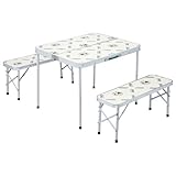 2つ折りのテーブルにベンチ2脚を収納するオールインワンタイプ。●材質:天板/プリント合板・フレーム/アルミ●使用時サイズ:テーブル/約85×68×65(h)cm・ベンチ/約83.5×27×38(h)cm●収納時サイズ:約85×10×35(h)cm●重量:約10.6kg