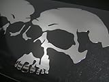 暗闇から浮き出るようなイメージで、ドクロをデザインしたカッティングステッカー・左右セットです。暗めの色…特に黒に貼ると映えるデザインとなっております。 素材は屋外での耐用年数が5年の鏡面ミラーシートを使用しております。塩ビ素材で伸びが良く、ヘルメットのような曲面にも貼る事が可能です。カラーは写真のシルバーミラーを含め全6色用意しております。クロームミラーは暗めのシルバーです。サイズは左右合わせて17.4cm×10cmとなります。