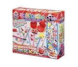 キラキラシールをおうちのえんぴつに巻いて、本体にデコパーツ、とめパーツ、チェーンをセットしてポンッと押すとチェーンにデコパーツがつながる。えんぴつにチェーンとヘッドパーツをつけたらできあがり!